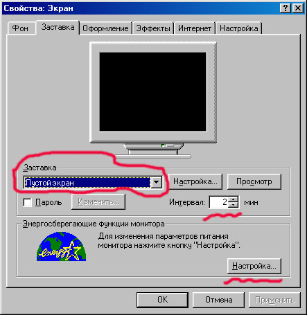 Вкладка «Заставка»: возможен выбор заставки, которая появится через установленное в настройках время в течение которого не было действий «мышкой» или не производился ввод данных с клавиатуры. Смысл заставки состоит в предохранении монитора от выгорания его люминесцентного слоя когда им никто не пользуется. В связи с этим желателен выбор заставки с минимальным количеством объектов на ней, а также с возможно меньшей цветовой насыщенностью. Этим требованиям идеально удовлетворяет заставка «Пустой экран», которая и установлена.