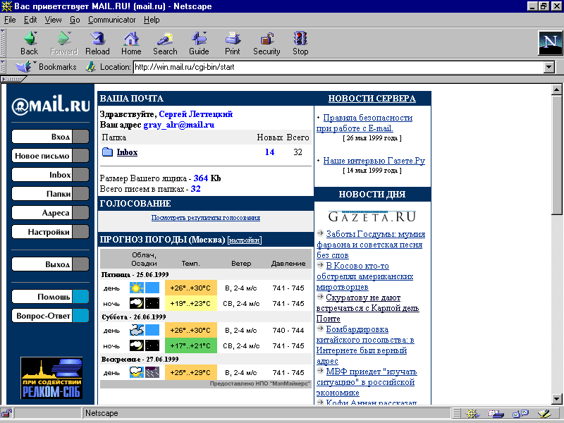 На рисунке показан графический интерфейс Web-броузера Netscape Navigator (версия 4.04) с открытой страничкой электронной почты (www.mail.ru).