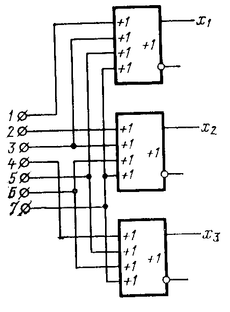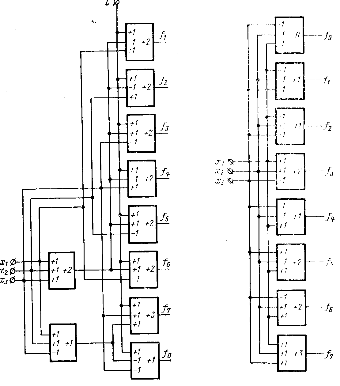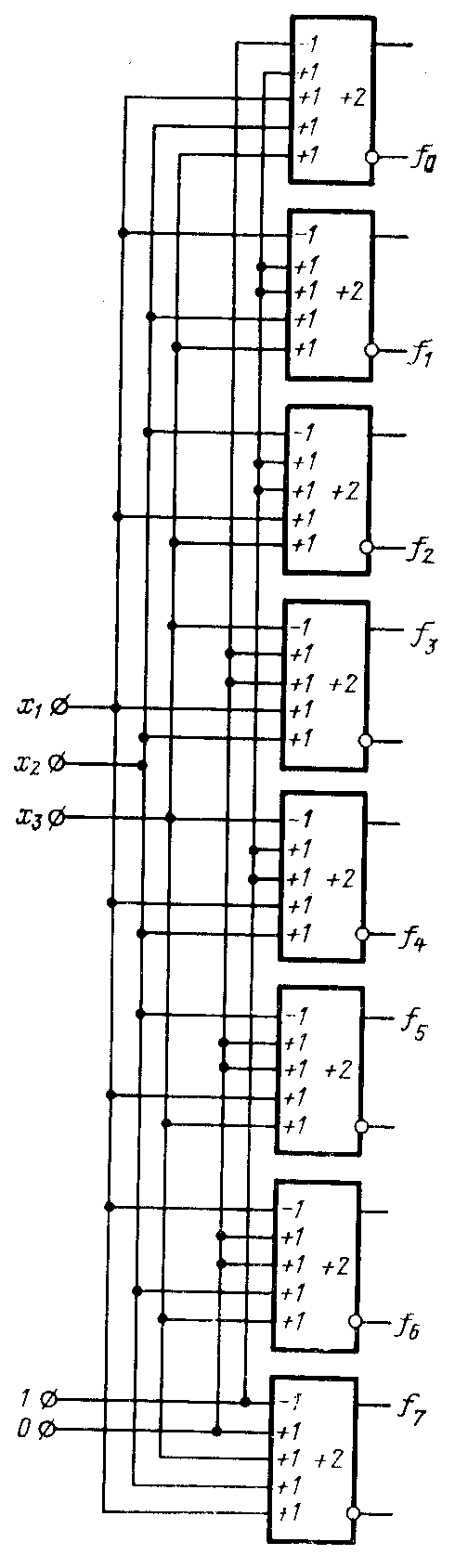 При использовании многовходовых ПЭ с прямым и инверсным выходами дешифратор можно построить на однотипных элементах. На рисунке 3 показан двоично-восьмеричный дешифратор, построенный на однотипных ПЭ, каждый из которых имеет четыре входа с весами +1 и один вход с весом –1, порог +2, прямой и инверсный выходы. Необходимые функции дешифратора (1-1) этим элементом реализуются путём подключения некоторых входов к постоянным логическим уровням 0 или 1 и снятия информации с прямого или инверсного выхода элемента.Многоступенчатые дешифраторы на ФН и ПЭ строятся точно так же, как на булевых элементах. Поэтому их не будем рассматривать.