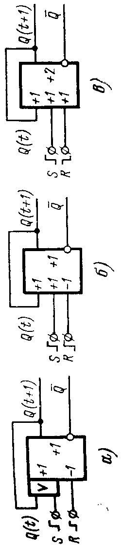 Изображая эту функцию в виде точечной диаграммы, а затем преобразуя её в пороговую диаграмму и синтезируя ФНО по алгоритму синтеза ФН, получим простейшую схему RS-триггера, показанную на рисунке 2-1а. Нетрудно проверить, что при отсутствии сигналов R и S (R=S=0) единичное состояние триггера, то есть возбуждённое состояние нейрона, устойчиво благодаря обратной связи с прямого выхода. Нулевое состояние триггера также устойчиво, так как оно соответствует невозбуждённому состоянию нейрона. При поступлении сигнала R=1 или S=1 состояние нейрона, следовательно, состояние триггера изменяется.