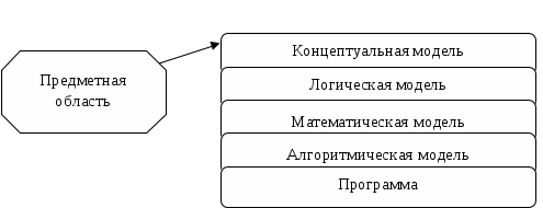 Конечно, таких критериев может быть очень много и выбор их в достаточной степени произволен. Далее будут рассмотрены некоторые из таких критериев, которые являются безусловно важными с точки зрения получения качественной базы данных: Адекватность базы данных предметной области Легкость разработки и сопровождения базы данных Скорость выполнения операций обновления данных (вставка, обновление, удаление кортежей) Скорость выполнения операций выборки данных База данных должна адекватно отражать предметную область. Это означает, что должны выполняться следующие условия: Состояние базы данных в каждый момент времени должно соответствовать состоянию предметной области. Изменение состояния предметной области должно приводить к соответствующему изменению состояния базы данных Ограничения предметной области, отраженные в модели предметной области, должны некоторым образом отражаться и учитываться базе данных. Кроме всего прочего СУБД позволяет: создавать пустую структуру базы данных; предоставлять средства ее заполнения; обеспечивать возможность доступа (Access, FoxPro, SQL-сервер, Delphi, Builder). Алгоритмизация и моделирование. Прежде чем приступить к решению поставленной задачи необходимо ее алгоритмизировать, то есть выбрать конкретный метод решения задачи и оформить в подетальном виде ее модель. В данном конкретном случае выбрана информационная модель решения. Важным инструментом исследования систем является метод моделирования, при котором исследуемый объект заменяется его моделью, то есть некоторым другим объектом, сохраняющим основные свойства реального объекта, но более удобным для исследования или использования. Информационная модель – это отражение предметной области в виде информации. Предметная область представляет собой часть реального мира, который исследуется или используется. Отображение предметной области в информационных технологиях представляется информационными моделями нескольких уровней (рис.2) Концептуальная модель обеспечивает интегрированное представление о предметной области и имеет словооформительный характер. Логическая модель формируется из концептуальной путем выделения конкретной части (подлежащей управлению), ее детализации и формализации. Логическая модель формализующая на языке математики во взаимосвязи в выделенной предметной области называется математической моделью. С помощью математических методов математическая модель преобразуется в алгоритмическую модель, задающую последовательность действий, реализующих достижение поставленной цели. На основе алгоритмической модели создается машинная (компьютерная) программа, является также алгоритмической моделью, но записанной на языке понятном компьютеру. Выделение информационных моделей разных уровней абстракции позволяет разделить сложный процесс отображения «предметная область - программа» на несколько итеративных, более простых, отображений