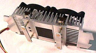 Получившийся монстр состоял из двух стандартных селероновых радиаторов, усаженных по обе стороны камня, плюс на каждом из них для лучшего нагнетания воздуха на решётку стоит сверху еще по одному кулеру. Как показывает практика, подобное спаривание вентиляторов увеличивает поток нагнетаемого на радиатор воздуха почти вдвое, а когда попадаются достаточно мощные кулера, то и более. Радиатор, сидящий на камне с фронтальной стороны для максимальной теплоотдачи крайне необходимо посадить на термопасту КПТ-8. Начинив подобным образом проц можно спать спокойно – по крайней мере, у меня и у всех, кого знаю, подобные монстры отлично вкалывают вообще без глюков, по крайней мере, если и возникает прецедент, то не по причине перегрева камня. У этого метода ещё один значительный плюс – если вдруг выходит из строя один из кулеров, то его живой сосед сверху/снизу не даст умереть/повиснуть камню.