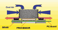 На рисунке справа показан воздухоток через кулер. Как мы видим, холодный воздух поступает с верхней части кулера, ускоряется вентилятором и выводится в нижней части. При выходе из кулера воздушный поток имеет скорость 3.5 метра в секунду и толщину порядка 10 мм. Выходящий воздух можно использовать для охлаждения различных компонентов вокруг процессора. Иллюстрация показывает установку кулера на SECC II процессор. Как видно, кулер занимает место, сопоставимое с размерами ядра процессора. При установке дополнительных радиаторов на микросхемы кэша SRAM, можно добиться того, что выходящий воздух будет охлаждать и кэш.