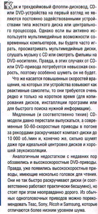 Для искусственного снижения скорости CD – приводов разработано немало программ – как универсальных, типа CDSlow (http://WWW/vdruzhin.ru/),Drivespeed2000 (http://WWW. Come. To/cdspeed) или CDbremse (http://www.cd-bremse.de/), так и специализированных, которые можно найти на сайтах соотвествущих производителей (хорошая утилита для снижения скорости вращения дисков есть, например, у компании ASuS).Снизив максимальную скорость вращения шпинделя до16>х> на внешних витках диска (на внутренних она будет вдвое ниже), мыполучим практически бесшумное устройство. Кстати, не забываете выставлять ражим поддержки DMA для работы дисководов под Windows.