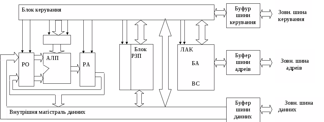 Блок регістрів загального призначення (РЗП) – це регістри, що призначені для тимчасового збереження інформації, що підлягає обробці. Головна особливість РЗП полягає в тому, що записати в ці регістри можливо тільки слова з внутрішньої магістралі данних. В цих регістрах зберігаються операнди, що підлягають обробці і сюди заносяться слова після виконання операцій.