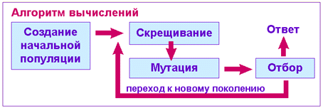 Блок-схема генетического алгоритма изображена на рис. 1. Вначале генерируется начальная популяция особей (индивидуумов), т.е. некоторый набор решений задачи. Как правило, это делается случайным образом. Затем мы должны смоделировать размножение внутри этой популяции. Для этого случайно отбираются несколько пар индивидуумов, производится скрещивание между хромосомами в каждой паре, а полученные новые хромосомы помещаются в популяцию нового поколения. В генетическом алгоритме сохраняется основной принцип естественного отбора — чем приспособленнее индивидуум (чем больше соответствующее ему значение целевой функции), тем с большей вероятностью он будет участвовать в скрещивании. Теперь моделируются мутации — в нескольких случайно выбранных особях нового поколения изменяются некоторые гены. Затем старая популяция частично или полностью уничтожается и мы переходим к рассмотрению следующего поколения. Популяция следующего поколения в большинстве реализаций генетических алгоритмов содержит столько же особей, сколько начальная, но в силу отбора приспособленность в ней в среднем выше. Теперь описанные процессы отбора, скрещивания и мутации повторяются уже для этой популяции и т. д.