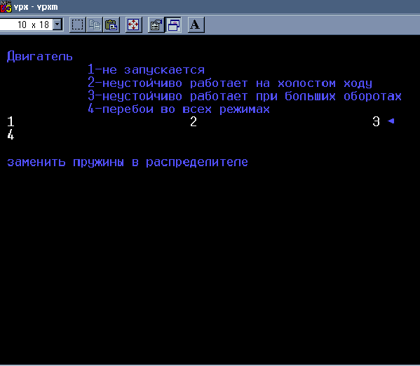 Во время работы пользователь отвечает на ряд вопросов с помощью выбора вариантов из предложенных (Enter- выбор варианта, End- продолжение работы), после чего ему предлагается способ устранения неисправности. Следующие копии экранов без комментариев показывают последовательность работы с системой.