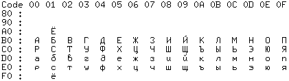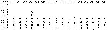 В данной таблице указано расположение русских букв в второй половине расширенной кодовой таблицы. |