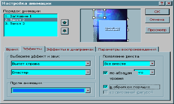 Затем для установки эффектов перехода можно использовать кнопки, поля и списки панели инструментов Сортировщик слайдов В слайд-фильме строки маркированного текста на текстовых слайдах могут появляться на экране либо все сразу, либо последовательно. Чтобы маркированный текст “выстраивался” на слайде, необходимо организовать эффект построения, выделив один или несколько текстовых слайдов с маркированным текстом, а затем выбрав тип эффекта в раскрывающемся списке Встроенная анимация текста панели инструментов Сортировщик слайдов или в диалоговом окне Настройка анимации.