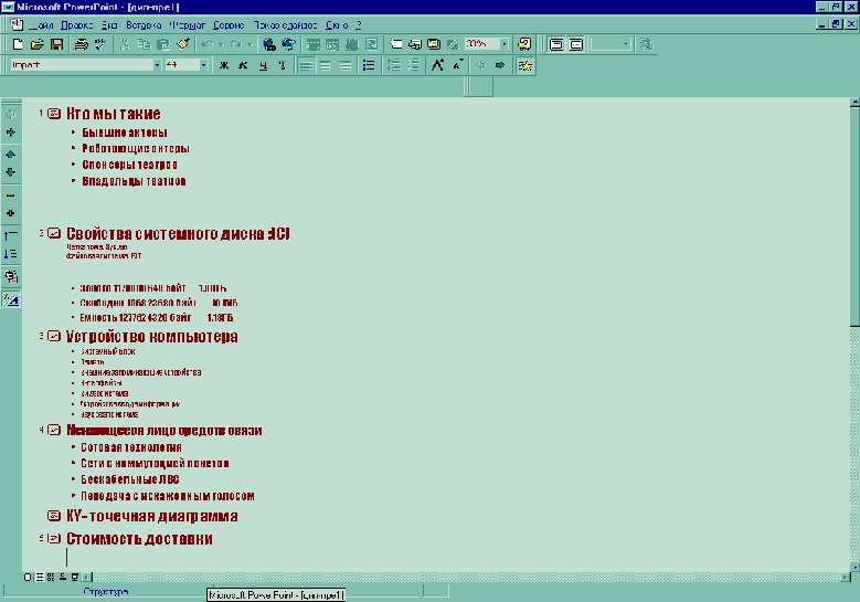 Преимущества режима структуры станут очевидны, как только понадобится переделать текст презентации. В этом режиме можно поменять последовательность тем, охватываемых презентацией, порядок элементов маркированного списка, касающихся некоторой темы или относящихся к разным темам. Можно также исключать темы, дублировать их и вставлять новые.