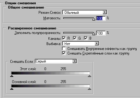 Элементы управления вкладки Опции смешивания окна Стили слоя.