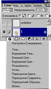 Для управления эффектами из палитры слоев предусмотрено специальное меню. Оно открывается щелчком правой кнопки мыши на значке «f» строки слоя. Верхняя часть меню содержит команды с названиями эффектов. Около примененных команд стоят галочки. Выбрав любую из команд, вы откроете окно Стиль слоя и передайте к редактированию эффекта – выбранного или любого другого.