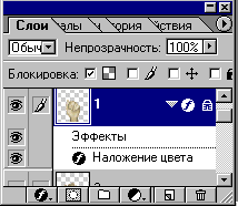 В палитре Слои довольно подробно показаны эффекты слоя. Если слой снабжен эффектами, рядом с его именем есть значок «f» со стрелкой. Стрелка может быть направлена вниз, и тогда в палитре ниже строки слоя показаны строки эффектов – сначала общая, затем по очереди каждый эффект отдельно. Если стрелка направлена вправо, то комплект эффектов не показан в палитре, закрыт. Чтобы посмотреть эффекты слоя, щелкните на стрелке. Повторный щелчок снова закроет комплект.