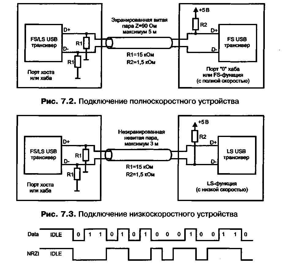 на линиях D+ и D-, смещаемых нагрузочными резисторами R2 приемопередатчиков (см. рис. 7.2 и 7.3).