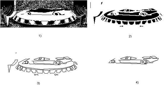 Распознавание предмета на сложном фоне осуществляется после предварительной обработки плоского цветного изображения. Вначале цветное изображение конвертируется в черно-белое со ступенчатой градацией яркости (см. первую часть рис. 2). Далее программа определяет границы между областями разной интенсивности и внутренние части областей, расположенных между этими границами, заливает черным цветом (см. вторую часть рис.2). Области, площади которых меньше некоторого критического размера, подбираемого заранее экспериментально, из рассмотрения исключаются (заливаются белым цветом). После этого включается в работу подпрограмма оконтуривания, которая обрабатывает каждую черную область, как это было описано выше. Результат выполнения данной операции приведен на третьей части рис.2. Далее по алгоритму, описанному выше, для каждого замкнутого контура определяются характеристическое число Х и из базы данных выбираются списки наиболее близких по составу набора единиц ракурсов трехмерных предметов. Поскольку в данном случае по сравнению с оконтуриванием по внешнему контуру частичные контуры предмета проще по составу и в числе Х меньшее число единиц, то, как правило, каждому простому внутреннему контуру программа находит из базы данных десятки возможных кандидатов.