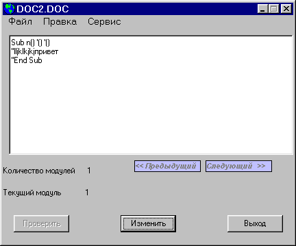 Видно, что стала доступной кнопка Изменить, появились цифры напротив надписей Количество модулей и Текущий модуль и надпись в поле редактора, а также изменился заголовок формы. Из данного рисунка следует, что документ, с которым мы работаем, называется Doc2.doc, он содержит 1 программный модуль, который в данный момент и является активным. Содержит он код, находящийся в поле редактора. После редактирования кода нужно нажать кнопку Изменить. Программа попросит подтверждения изменения модуля, и, получив его, заменит код текущего модуля на новый, находящийся в настоящее время в окне редактора.