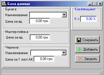 В другий формі “База даних” можна зробити запис у базу, даних які використовуються при обчисленні ціни замовлення.