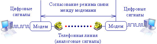 Для осуществления связи один модем вызывает другой по номеру телефона, а тот отвечает на вызов. Затем два модема автоматически «договариваются» между собой о максимально возможной для обоих скорости передачи данных и выборе коммуникационного протокола. Коммуникационный протокол описывает способы передачи байтов по телефонной линии, а также то, как байты объединяются в пакеты, порядок переповтора передачи в случае искажения пакета и т. п.. После этого передающий модем начинает посылать модулированные сигналы с согласованной скоростью и форматом. Модем на другом конце преобразует полученную информацию в числовой вид и передает ее своему компьютеру. Закончив сеанс связи модем отключается от линии.