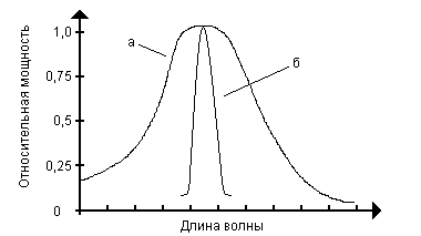 Лазеры являются когерентными источниками, обладающими узкой спектральной шириной излучения (1-3 нм, в идеале – монохромные). Лазер дает узконаправленный луч, необходимый для одномодового волокна. Длина волны – 1300 или 1550 нм, осваиваются и более длинноволновые диапазоны. Быстродействие выше, чем у светодиодов. Лазер менее долговечен, чем светодиод, и более сложен в управлении. Мощность излучения сильно зависит от температуры, поэтому приходится применять обратную связь для регулировки тока. Лазерный источник чувствителен к обратным отражениям: отраженный луч, попадая в оптическую резонансную систему лазера, в зависимости от сдвига фаз может вызвать как ослабление, так и усиление выходного сигнала. Нестабильность уровня сигнала может приводить к неработоспособности соединения, поэтому требования к величине обратных отражений в линии для лазерных источников гораздо жестче. Лазерные источники применяются и для работы с многомодовым волокном (например, в технологии Gigabit Ethernet 1000Base-LX). Спектральные характеристики излучателей изображены на рис. 5.