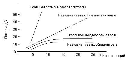 В разветвителе “звезда” свет, входящий в любой порт, равномерно распределяется между всеми остальными. На основе такого разветвителя может строиться сеть с разделяемой средой передачи и звездообразной топологией. Здесь рост потерь с увеличением числа узлов происходит гораздо медленнее, но расплатой является большая потребность в оптическом кабеле — от каждого абонента к разветвителю идет пара волокон. На рис. 8 приведены графики потерь для сетей с идеальными (без внутренних потерь) и реальными разветвителями обоих типов.
