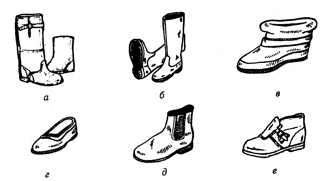 Рис. 2.3.6. Специальная обувь: а – сапоги комбинированные, для захищиты от механичных повреждений и влияния высоких и низких температур; б – сапоги резиновые или из полимеров; в – диэлектрические боты; г – калоши; д – боттнки кожанные для работников с высокой запыленностью и взрыво-опасностью цехов; е – туфли, для защиты от контакта с нагретыми поверхностями.