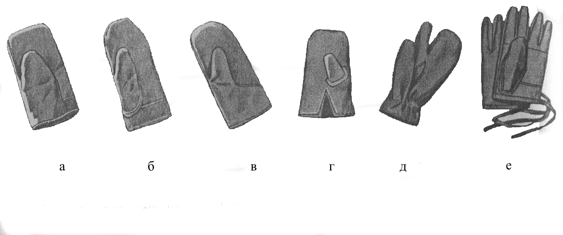 а, б, в – рукавицы специальные (типа А, Б, В); г – рукавицы из меха (тип В); д – рукавицы зимние двухпальцевые тканевые; е – перчатки тканевые