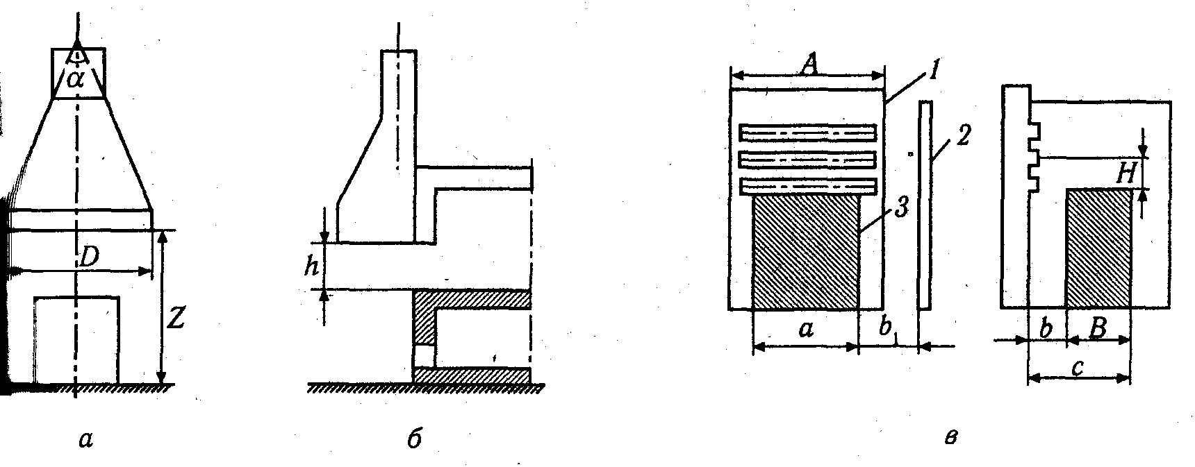 Рис.2.3.2. Вытяжной зонт: а - вытяжка сверху; б - сбоку; в - всасывающее устройство: 1-всасывающая панель; 2-экран; 3-источник вредности.