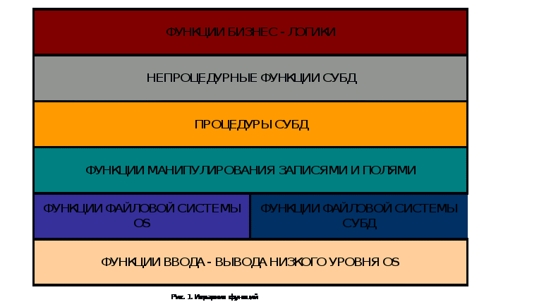 На самом нижнем (нулевом) уровне лежат функции (вызовы) ОС, обеспечивающие ввод-вывод информации. Чуть выше – функции файловой системы ОС или СУБД (в некоторых профессиональных СУБД они подменяют собой функции ОС) – это первый уровень. Еще выше – уровень процедур выборки данных СУБД (“считать текущую запись в буфер”… “переместиться на N записей” …. и т.п., сюда же относится и транзакционный механизм, сетевые блокировки и т.п.) – второй уровень. Далее следует уровень непроцедурных функций СУБД (SQL или другой непроцедурный язык манипулирования данными) – третий уровень. Следующий, четвертый уровень – это “технические” функции приложения (обеспечивающие преобразование данных, пользовательский интерфейс, интерфейс прикладного программирования и т.п., но являющиеся уже не функциями инструментального пакета СУБД, а пользовательскими функциями, созданными при программировании прикладной системы). Эти функции отвечают за логику программы. Пятый уровень – это бизнес - функции приложения, определяющие логику деятельности.