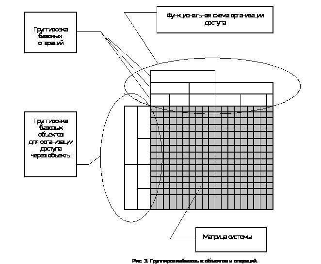 является обособленной системой (ей все равно, какую прикладную систему защищать). На этом этапе разработки все объекты регистрируются в системе безопасности, после чего с учетом конкретных требований по защите от несанкционированного доступа “прописываются” процедуры прикладных систем (в основном они представляют собой вызов из прикладных процедур соответствующих им процедур системы безопасности). В результате создается некая матрица системы защиты, устанавливающая взаимосвязь между базовыми объектами и базовыми операциями. Базовый объект - это абстрактное понятие, опосредованно отражающее суть происходящего в системе. Примерами базовых объектов являются “документ” и “картотека”. Под базовой операцией понимается операция проблемной области, реализованная как целостный (неделимый) набор определенных технологических действий и описанная в терминах предметной области. Примерами базовых операций могут служить “проверка”, “проводка”, “откат”.