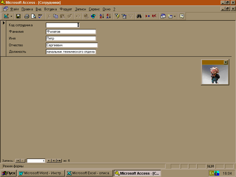 Для первоначального ввода данных необходимо активизировать вкладку Формы. Левой кнопкой мыши выделите форму “Сотрудники”. Нажмите кнопку “Открыть”. При этом экран будет выглядеть так: