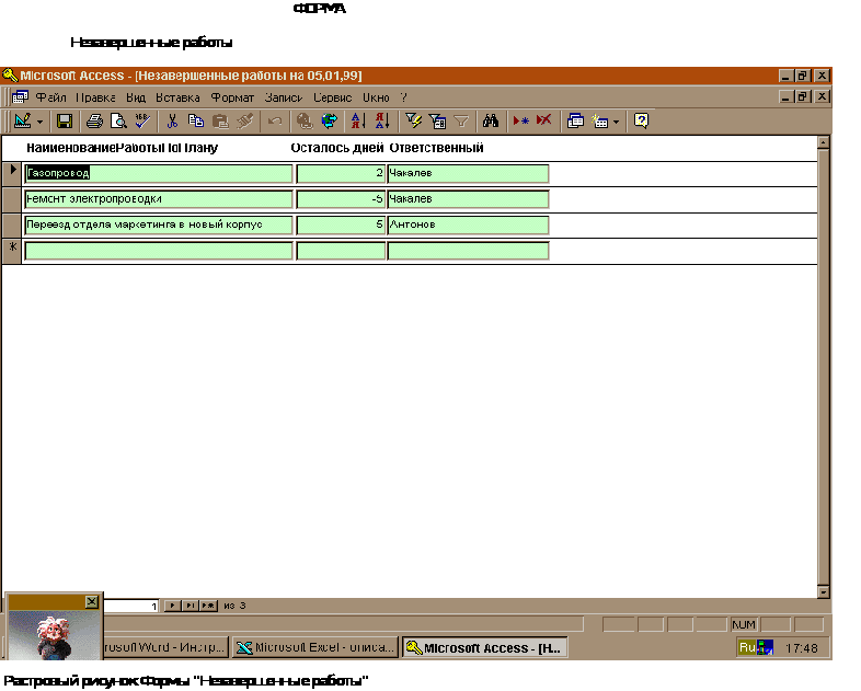 На экране появится отчет о состоянии дел на 09 января 1999г. В графе “Осталось дней” данные со знаком “ - ” говорят о том, что срок выполнения данной работы уже наступил, число со знаком “+” показывают, сколько дней осталось до момента выполнения задания.