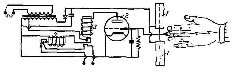 1 – трубка Гейгера; 2 – тиратронная лампа; 3 – контрольное реле; 4 – аварийное реле.