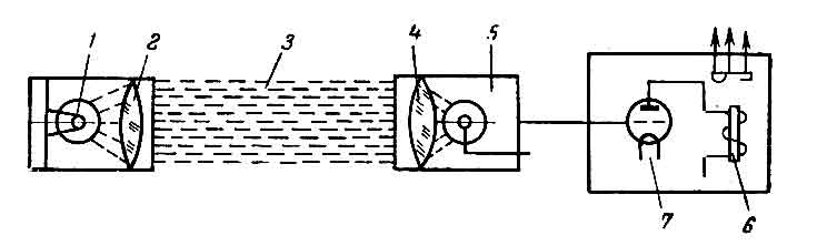 1 – источник света; 2, 4 – линзы; 3 – пучок параллельных световых лучей; 5 – приемник световых лучей; 6 – контрольное реле; 7 – усилитель.