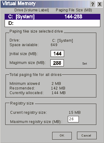 Физическую память следует рассматривать как данные, хранимые в дисковом файле со страничной структурой. Поэтому, когда приложение передает физическую память какому-нибудь региону адресного пространства (вызывая VirtualAttoc), она на самом деле выделяется из файла, размещенного на жестком диске. Размер страничного файла в системе — главный фактор, определяющий количество физической памяти, доступное приложениям. Реальный объем оперативной памяти имеет гораздо меньшее значение. Физическая память в страничном файле не хранится Windows 2000 может использовать несколько страничных файлов, и, если они расположены на разных физических дисках, операционная система работает гораздо быстрее, поскольку способна вести запись одновременно на нескольких дисках. Чтобы добавить или удалить страничный файл, откройте в Control Panel апплет System, выберите вкладку Advanced и щелкните кнопку Performance Options. Нa экране появится следующее диалоговое окно.