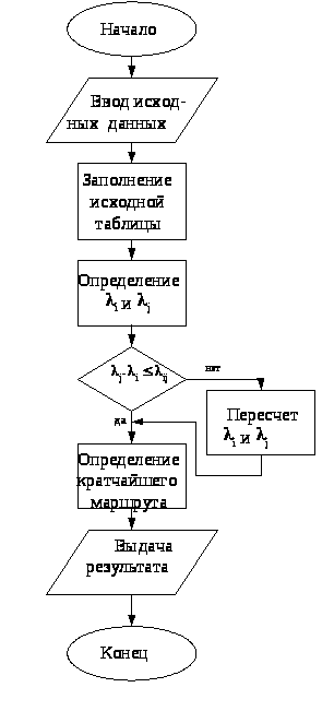 Алгоритм метода Форда содержит четыре этапа (схема 1). На первом этапе производится заполнение исходной таблицы расстояний от любого i-го пункта в любой другой j-й пункт назначения. На втором этапе определяются для каждого пункта некоторые параметры l>i> и l>j> по соответствующим формулам. Далее на третьем этапе определяются кратчайшие расстояния. Наконец, на четвертом этапе определяются кратчайшие маршруты из пункта отправления Р>1> в любой другой пункт назначения Р>j>, j=1,2,...,n.