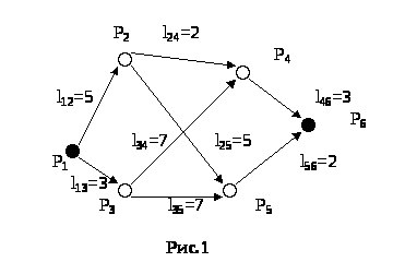 На практике часто встречается задача определения кратчайшего маршрута по заданной сети из начального пункта до конечного пункта маршрута. Транспортная сеть может быть представлена в виде графа (рис.1), дуги которого - транспортные магистрали, а узлы - пункты отправления и назначения. Графически транспортная сеть изображается в виде совокупности n пунктов P>1>,P>2>,...,P>n>, причем некоторые упорядоченные пары (P>i>,P>j>) пунктов назначения соединены дугами заданной длинны r(P>i>,P>j>)=l>ij>. Некоторые или все дуги могут быть ориентированы, т.е. по ним возможно движение только в одном направлении, указанном стрелками.