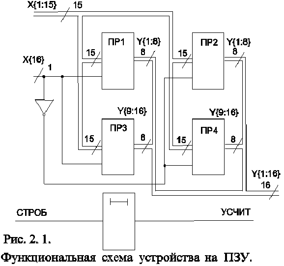 Входной код Х{1:15} используется в качестве адреса и подается параллельно на все микросхемы РПЗУ (ПР1-ПР4). Разряд Х{16} используется для выбора пары микросхем (ПР1, ПР3 или ПР2, ПР4). Микросхемы ПР1, ПР2 хранят младшие 8 бит выходного кода (Y{1:8}), а ПР3, ПР4 - старшие (Y{9:16}). Сигнал УСЧИТ образуется путем задержки сигнала СТРОБ на максимально возможное время формирования выходного кода. Для частоты ГТИ в 5 МГц потребуется задержка на три такта.