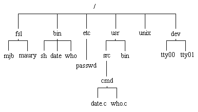 лы, соответствующие дочерним вершинам, являются либо каталогами, либо обычными файлами, либо файлами устройств. Имени файла предшествует указание пути поиска, который описывает место расположения файла в иерархической структуре файловой системы. Имя пути поиска состоит из компонент, разделенных между собой наклонной чертой (/); каждая компонента представляет собой набор символов, составляющих имя вершины (файла), которое является уникальным для каталога (предыдущей компоненты), в котором оно содержится. Полное имя пути поиска начинается с указания наклонной черты и идентифицирует файл (вершину), поиск которого ведется от корневой вершины дерева файловой системы с обходом тех ветвей дерева файлов, которые соответствуют именам отдельных компонент. Так, пути "/etc/passwd", "/bin/who" и "/usr/src/cmd/who.c" указывают на файлы, являющиеся вершинами дерева, изображенного на Рисунке 1.2, а пути "/bin/passwd" и "/usr/ src/date.c" содержат неверный маршрут. Имя пути поиска необязательно должно начинаться с корня, в нем следует указывать маршрут относительно текущего для выполняемого процесса каталога, при этом предыдущие символы "наклонная черта" в имени пути опускаются. Так, например, если мы находимся в каталоге "/dev", то путь "tty01" указывает файл, полное имя пути поиска для которого "/dev/tty01".