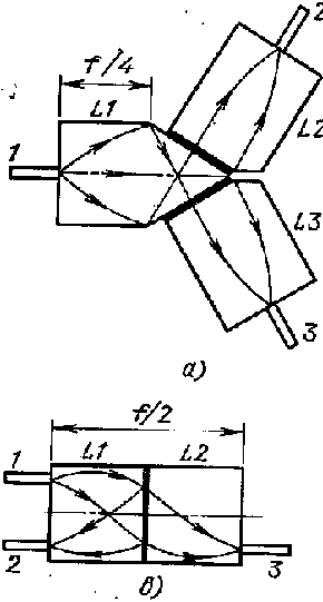 Рисунок 3.2.5 - Разветвители с градиентными диэлектрическими линзами: L1, L2, L3 —линзы: 1—входной ВС; 2,3 — выходные ВС; f— фокусное расстояние линзы