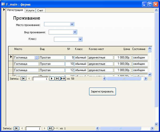 Для занесения информации о прибывшем отдыхающем необходимо на вкладке ‘Регистрация’ при помощи поиска выбрать подходящий номер (по местонахождению, по виду, классу) в форме ‘f_nomer’, затем нажать на кнопку «Зарегистрировать», при нажатии которой откроется форма ‘Sdan_nomer’ и последовательно заполнить все поля. После занесения всех необходимых сведений, необходимо нажать кнопку ‘Вселить’ и данные об отдыхающем внесутся в таблицы.