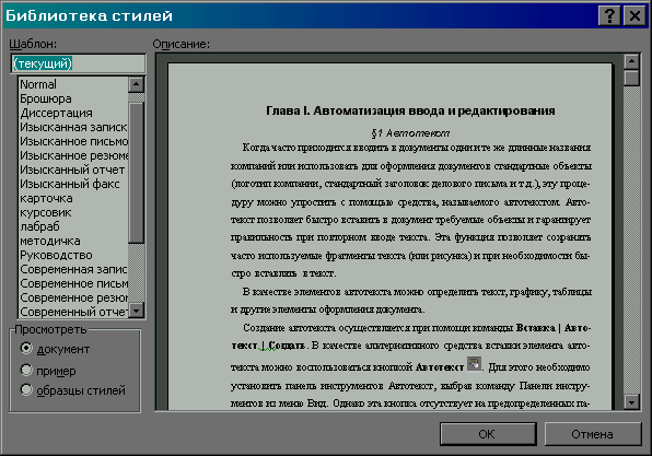В результате вызова функции открывается окно диалога «Автотекст», предоставляя наиболее широкие возможности по работе с элементами автотекста. Из верхнего списка можно выбрать элемент автотекста и просмотреть на его содержимое.