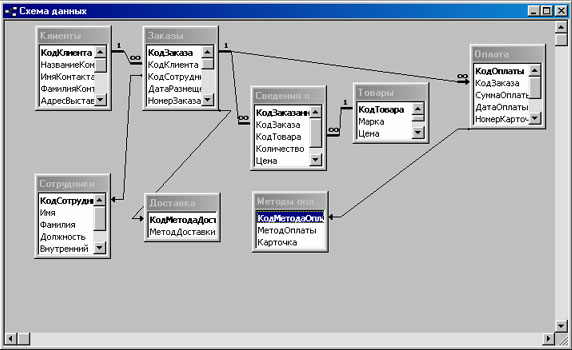 После распределения данных по таблицам и определения ключевых полей необходимо выбрать схему для связи данных в разных таблицах. Для этого нужно определить связи между таблицами.