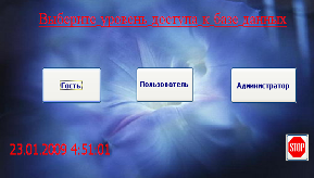 После запуска приложения, первое окно которые вы видите - это форма входа в СУБД под названием «Вход», на которой расположены кнопки трех видов пользователей: Гость, Пользователь, Администратор.
