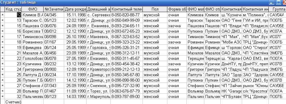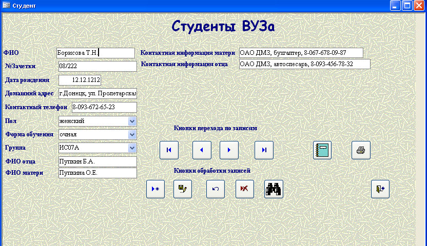 Для разработки такой базы нам необходимо знать такую информацию о студентах: ФИО, контактный телефон, домашний адрес (включая область, город (поселок и т.д.) и индекс, т.к. студент может быть иногородним), пол, форма обучения (очная/заочная), № зачетки, год рождения. Если, допустим, невозможно связаться со студентом (долго не было в ВУЗе, изменились контактные данные и т. д.) или о чём-то необходимо сообщить их родителям, то нам потребуется их информация, а именно: ФИО мамы и ее контактные данные, а также ФИО и контактная информация папы. Если нет родителей, то указываем контактные данные родственников (близких).