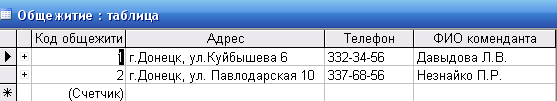К «Общежитию» относятся 3 свойства: адрес, ФИО коменданта, номер телефона общежития.