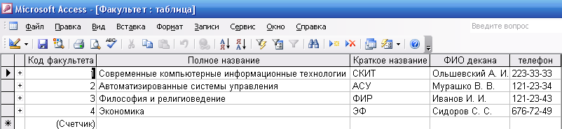 Объект «Факультет» характеризуется свойствами: полное название, краткое название, Ф.И.О. декана, № телефона деканата.