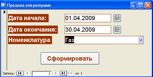 WHERE (((Номенклатура.Наименование)="Газ") And ((Продажа.КодСмены)=Forms!РеализацияГаза!ПолеСоСписком0))