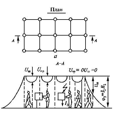 а – вид в плане; б – распределение потенциала при пробое фазы на корпусе; U>пр> – напряжение прикосновения; U>ш> – напряжение шага; I>з> – ток замыкания на землю на землю при пробое фазы за корпус; φ>пр> – потенциал замыкания; R>з> – сопротивление заземлителя.