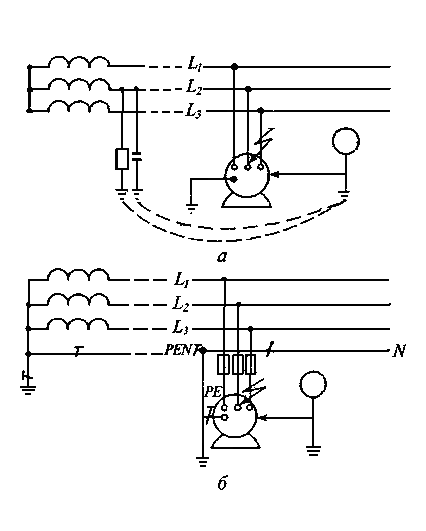 Рис. 3. Трехфазные электрические сети с заземленной нейтралью: