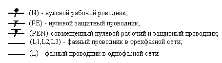 L1,L2,L3 – фазы; N – нулевой рабочий провод; PE – защитный проводник; PEN – защитный проводник, совмещенный с нулевым проводом.
